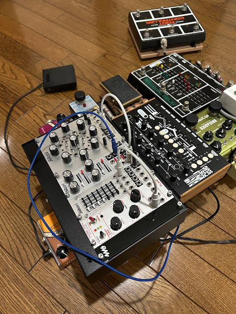 とにかく動画を見れば、TuneとShiftを微調整することでラジオのチューニングを弄るかのようにジリジリとしたノイズが放出されます。この変調に合わせるのは先日購入したばかりの'Pedal Shop Cult Presents' によるElectrograve謹製のステレオ・ノイズマシン、Superposer  SP-1。設計者のKaz Koike氏曰く '半導体の絶叫' を具現化したノイズマシンとのことで、本機はレギュラーモデルのQuad Osscillatorから移植されたオシレータをL-Rそれぞれに4つずつ、計8つ搭載して個別にOn/Off(キルスイッチ)しながら加算、減算合成により生成させて行きます。さて本機で重要なのはステレオL-Rにより干渉させていくことにあり、周波数帯域を変調させるFilterとモジュレーションのLFOを司るRateとStabilityにより音色のヴァリエーションが変わります。まあ、いわゆる原始的なオシレータの塊なので好き勝手にあれこれツマミを触って 'ちょうど良いところ' を一期一会的に発見、チューニングしていくのが '正解' ですね(笑)。この手のガジェット的なノイズマシンというのは大抵、シンプルにしてお手軽に作ってあるもの(失礼)が多いのだけど、本機はさすがCultと思わせるこだわりの作りなのが素晴らしい。その弁当箱サイズの筐体から受ける見た目そのまま...ズッシリとめちゃくちゃ重いです!。この重厚感にして、筐体を開ければギッシリと詰まった基板の塊にニンマリしながら所有欲を満たすと共に本機がひとつの創造的な '楽器' であるというコンセプトに嘘はありません。せっかくのステレオなのでここはグリッチ系ペダルを得意とするノルウェーの工房、Pladask Elektriskから登場した4チャンネル ×  4チャンネルのマトリクス接続のMatriseでパラレル・ミックス。通常のミックスからパラレル・ミックスのほか、出力を再度入力することで生じる 'フィードバック技' など攻撃的な使い方までカバーします。これはDeath by AudioのTotal Sonic AnnihilationやFairfield Circuitry Hors D'oeuvre ?などの 'フィードバック・ルーパー' ペダルでお馴染みの機能でもありますね。てか、このクソ暑い真夏に遊ぶようなペダルじゃない...(苦笑)。